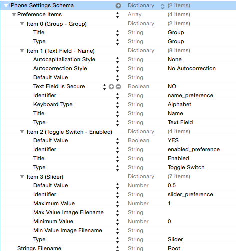 En el ejemplo que se muestra a continuación, que se corresponde con el Root.plist que crea por defecto Xcode, puede verse que el item 1 es de tipo "campo de texto", que su title (la etiqueta que se ve en las preferencias) es Name, que el widget tiene una serie de propiedades (cuando se edita aparece un teclado alfabético, no es seguro - o sea, se muestra el contenido, …) y está asociada a la preferencia cuya clave es name_preference (propiedad Identifier).