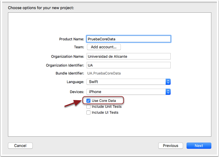 Para comenzar a hacer pruebas no es necesario escribir este código de inicialización, Xcode lo puede hacer por nosotros. Para ello, hay que marcar la casilla de "Use Core Data" que aparece al crear un nuevo proyecto de Xcode, tras elegir la plantilla.