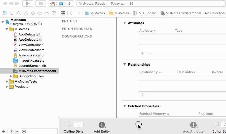 Para gestionar las entidades debemos editar el archivo xcdatamodeld. En el editor visual de Xcode podemos, entre otras cosas, añadir entidades. Vamos a crear la única entidad que necesitamos en nuestra aplicación: Nota. Para ello seguir estos pasos: