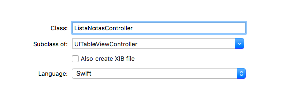 File>New>File...). De las plantillas que aparecen usaCocoa Touch Class, así Xcode generará código por nosotros. La clase se debe llamarListaNotasControllery heredará deUITableViewController.
