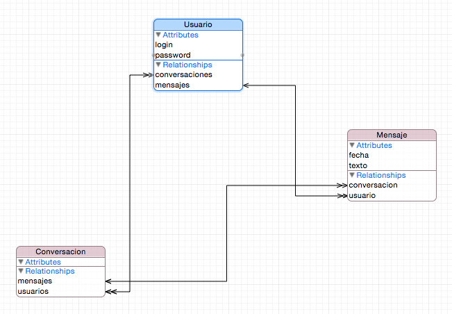 Mensajey queremos establecer una relación con elUsuarioque lo ha enviado llamaríamos a la relación simplementeusuario. Si es una relación uno a muchos se suele usar el plural. Así, si tenemos un`Usuarioy queremos vincularlo con todos sus mensajes llamaríamosmensajesa la relación. - Destino: la entidad vinculada