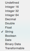 La mayoría son bastante autoexplicativos, salvo los dos últimos. El tipo binario se usa típicamente para imágenes, audio, .... En cuanto a transformable nos permite almacenar cualquier clase Swift/Obj-C. Se parece al binario en el sentido de que en el fondo, los datos se van a almacenar también en binario, pero con transformable proporcionamos un medio de hacer la conversión y a partir de ahí nos "olvidamos" de que el dato se está convirtiendo, si trabajamos con clases propias solo veremos el tipo original.