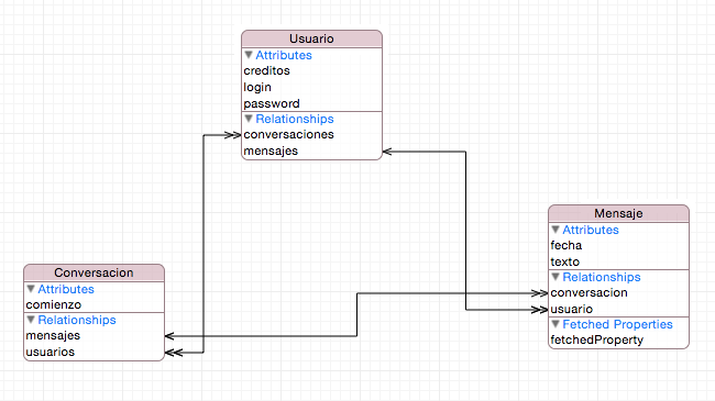 Nótese que en la definición de la clase tenemos no solo las propiedades de la entidad en sí sino también variables que representan las relaciones. Por ejemplo en el diagrama puede verse una relación uno a muchos entre Usuario y Mensaje llamada mensajes, que representaría los mensajes enviados por un usuario. Esta relación se representa en código con la propiedad del mismo nombre. Esto quiere decir que si tenemos un usuario y vamos imprimiendo los objetos contenidos en la propiedad mensajes en realidad estaremos accediendo a la entidad Mensaje. Esto es mucho más sencillo y "limpio" que andar haciendo JOINs en SQL para obtener los datos relacionados.