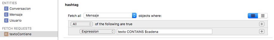 - Con un template, que básicamente es un predicado en forma de cadena en el que se incluyen variables, algo así como los parámetros de las queries en SQL. En Core Data podemos crear este tipo de predicados directamente desde el editor del modelo de datos, son las fetch request templates que ya comentamos.