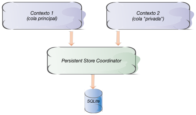 El contexto de persistencia está conectado con un Persistent Store Coordinator, cuyo trabajo, como su propio nombre indica, es el de gestionar el almacenamiento persistente. Cuando almacenamos un objeto haciendo save del contexto, es el store coordinator el que se encarga de "pelearse" con la base de datos SQLite (o con el almacenamiento que sea). Cuando tenemos varios contextos, típicamente están todos "conectados" con el mismo coordinator. Este es el esquema más típico en aplicaciones iOS.
